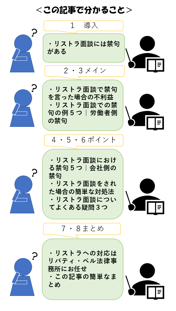 以上のとおり、今回は、リストラ面談の禁句5つを説明したうえで、言った場合の不利益と簡単な対処法を解説しました。